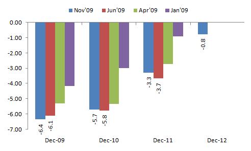The development of the implied optimal fnds rate implied by the economic forecasts showed some improvement in 2010 and 2011, but as of November 2009, the FOMC forecasts (I’m using the mid of the range) suggest that the extended period (Mr Hoenig dissented against) stretches out to 2013…
