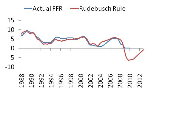 Rudebusch estimates something akin to a traditional Taylor rule (but not exactly the rule Taylor proposed). He estimates: