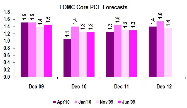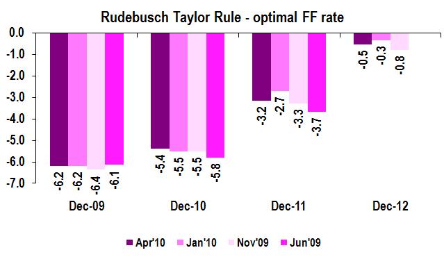 The net effect of the Fed’s April forecast revisions is to marginally put off the date of their first rate hike. The April forecasts are consistent with the Fed funds rate being unchanged at the current 0bps to 25bps through 2012. Using the Rudebusch (2009) Taylor / Fed-funds formula, it remains the case that optimal policy is to have negative rates through 2012.