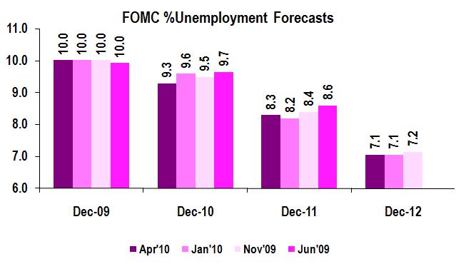 round, up 5bps from the Jan forecasts. Those who are arguing that the Fed will hike in 2010 or 2011 because the economy has less slack than the unemployment rate suggests must explain why the Fed Governors agreement with this argument amounts to only a few basis points.