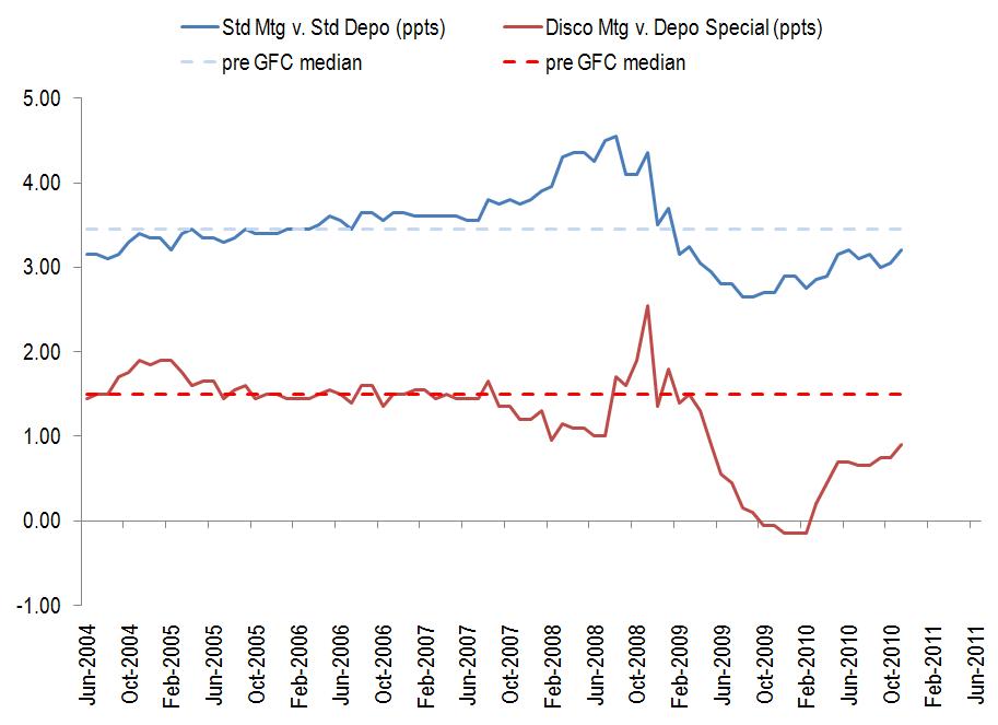 As a result, the difference between standard mortgage and average deposit rates is now 320bps, or 25bps below the 2004/07 (pre-GFC) median. The difference between discounted mortgage rates and deposit specials is now ~90bps, or 60bps below the pre-GFC median.