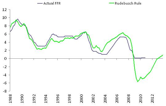Anyhow, the skinny is that the Fed’s Nov 2010 forecasts suggest they are on hold at zero until 2014/15. Using the SF Rudebusch Taylor Rule, these forecasts imply that the optimal rate will rise above zero in Q1’13.