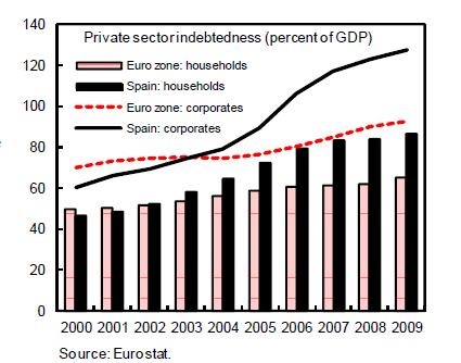 I found this Chart in an IMF publication – it shows that debt owed by Spanish households and corporates is well above the European average.