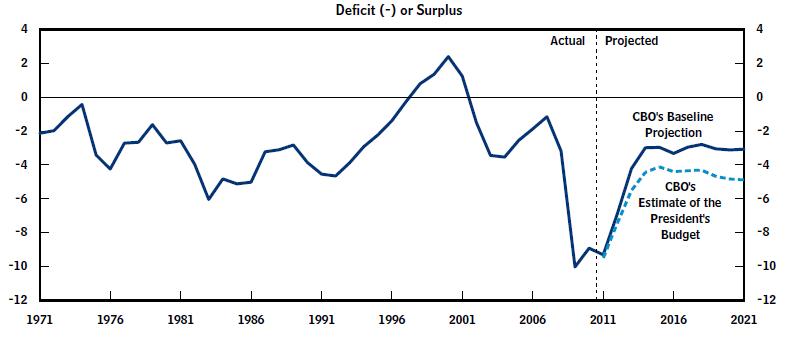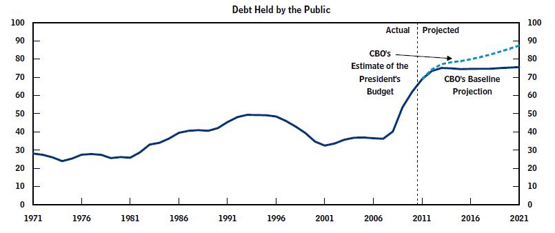 The problem with Obama’s budget is that it didn’t do anything about the long term fiscal problems of the USA. The CBO’s projections show that the deficit never gets any better than 4% of GDP, and that as a result debt to GDP grows at a little less than 2ppts of GDP per year.
