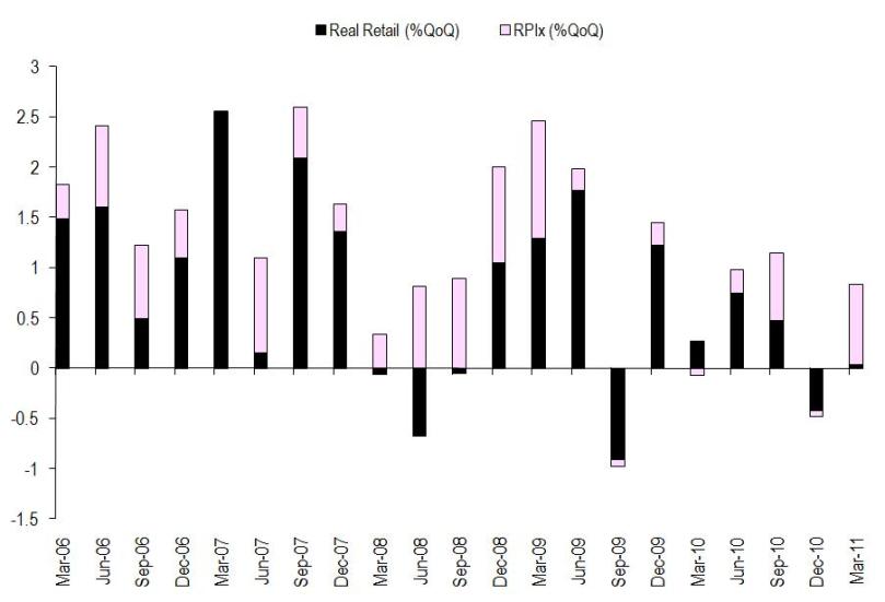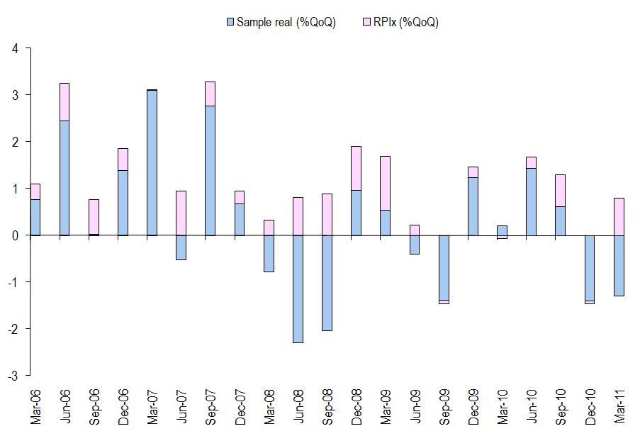 In the sample, we find that nominal spending fell by 0.8%q/q, with real spending down 1.3%q/q, thanks to a +0.5%q/q increase in retail price inflation.