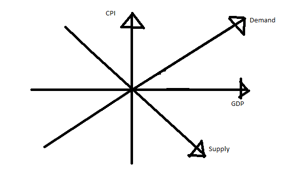 Doing this properly is difficult; however a quick and simple way to get an impression of what’s going on is rotate the CPI-GDP space by 45 degrees. The sketch above gives the idea. An increase in demand makes both inflation and GDP rise together; an increase in supply makes inflation fall and GDP rise (so a supply shock, such as we had will tend to make prices rise and GDP fall).