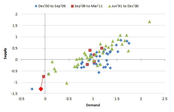 This idea needs a lot more work – for example, it’s not clear we should rotate by 45’. I like the story that the drop on the production side means that there was more inflation due to lower supply. A potential source of bias in the above method is that there has not been an adjustment for the drop in supply potential due to the floods. That would, of couse, mean the even more of the inflation pulse was due to supply factors.