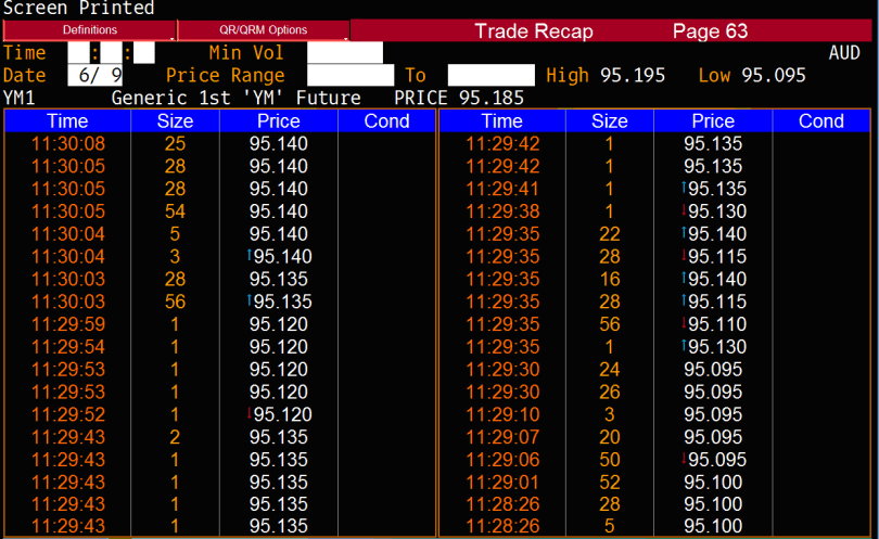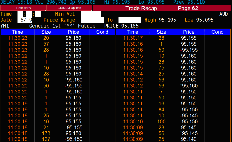 The above is a trade recap table, which shows the history of trades – with volume at price and time exchanged. What Chris probably noted was that someone paid up to 95.14 to trade just prior to the release at 11.30am.