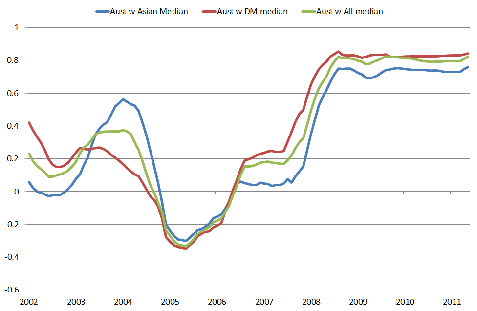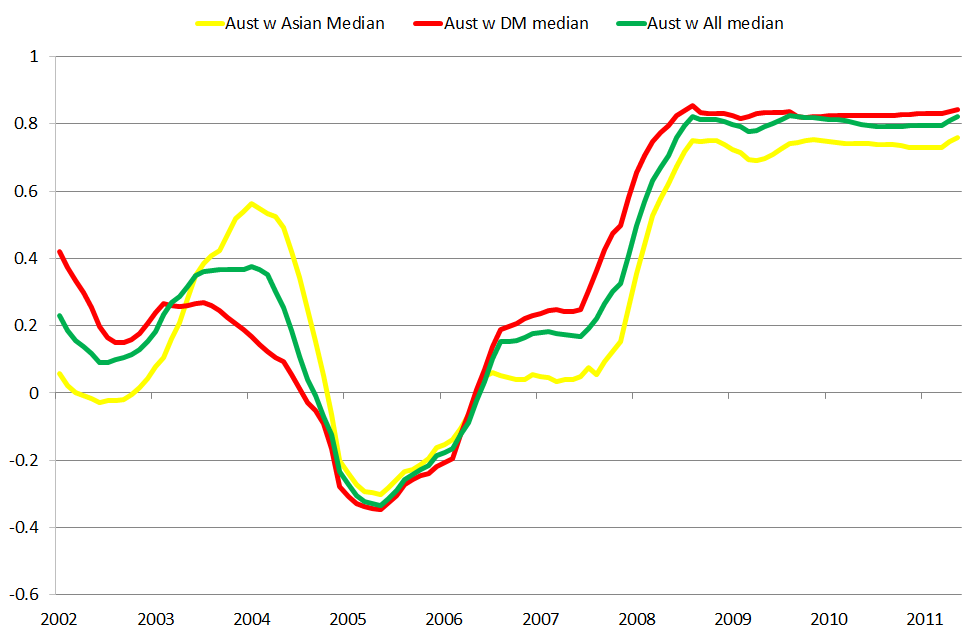 Finally, I think it is interesting to note that the cross market correlation of inflation has increased over the past ten years. The above chart shows the rolling 5yr correlation between Australian inflation, and the three global inflation measures I showed above (the DM median, Asian median, and All markets median).