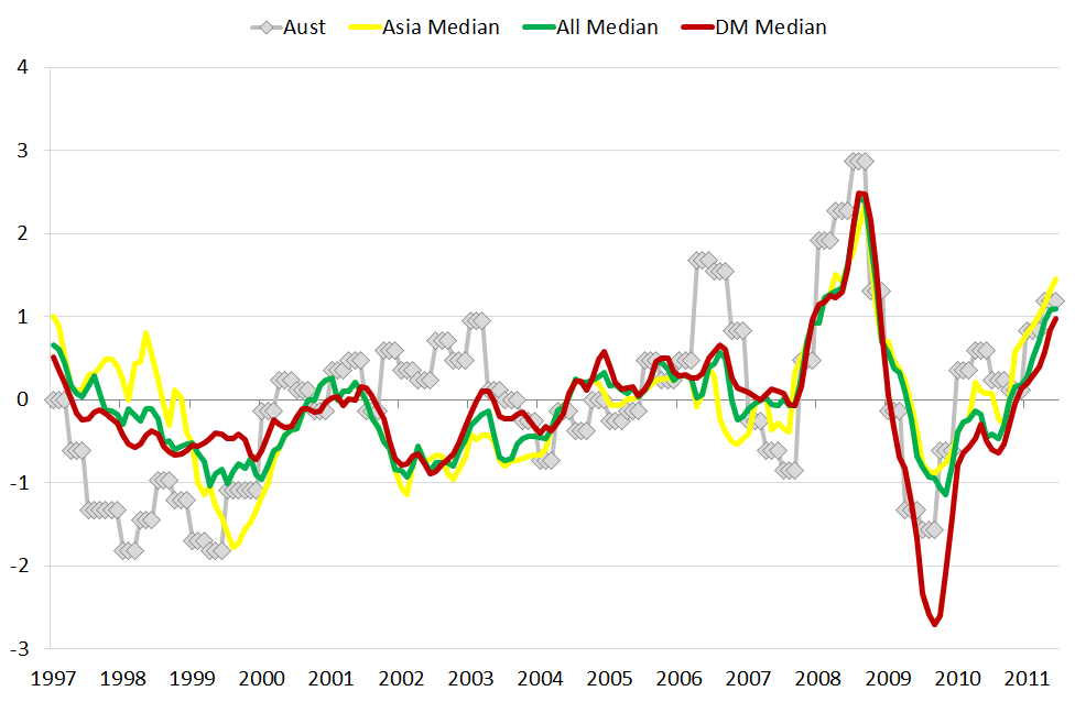 Apart from the fact that the RBA has told us the measure of inflation they prefer (the 2q average of the trimmed mean, which is 3.7%y/y AR), and that the best thing a Central Bank can do to stabilise inflation expectations (and hence inflation) is to pick some metric and stick to it, I think it’s worth looking at global inflation to see if the Australian inflation pulse is markedly different from what we’d expect, given peer inflation.