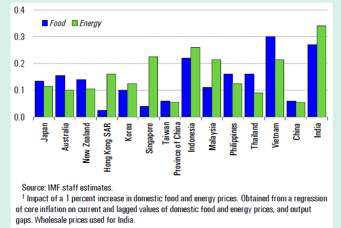This assertion is also at odds with other research. IMF has done the work more carefully than I have time (just now), and they find that a one percentage point increase in global food prices causes a ~25bps increase in Australian food prices; similarly a one percentage point increase in energy prices causes domestic energy prices to increase by ~10bps.