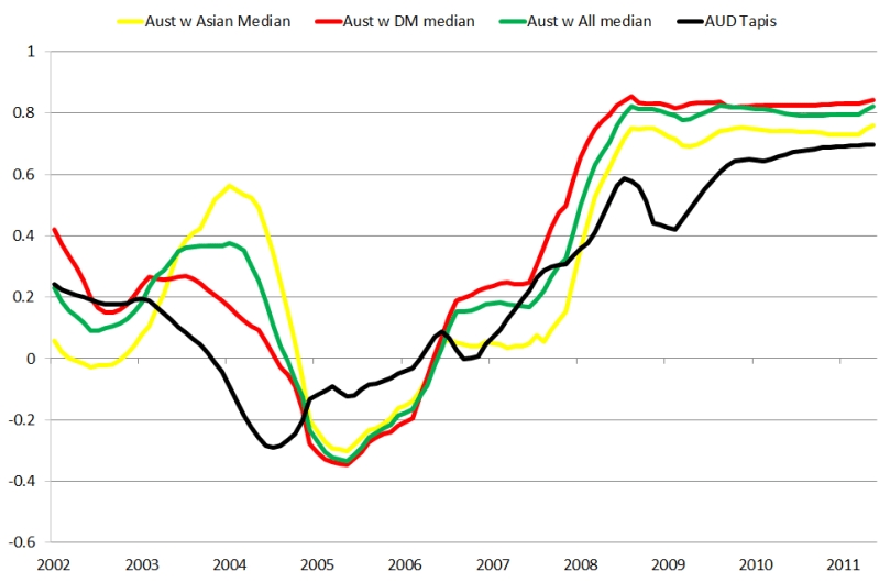 Note in particular the earlier decline of oil prices in the financial crash, and the earlier increase in oil prices during the recovery — this is the first clue to what is going on here. Note also that the drop and increase in CPI was globally coordinated, and that it followed oil with a lag. Finally, correlation remains high but it is lower than the correlation between national CPIs (note i switched to 2yr rolling averages, as it better shows up the difference in correlations when there is a phase shift).