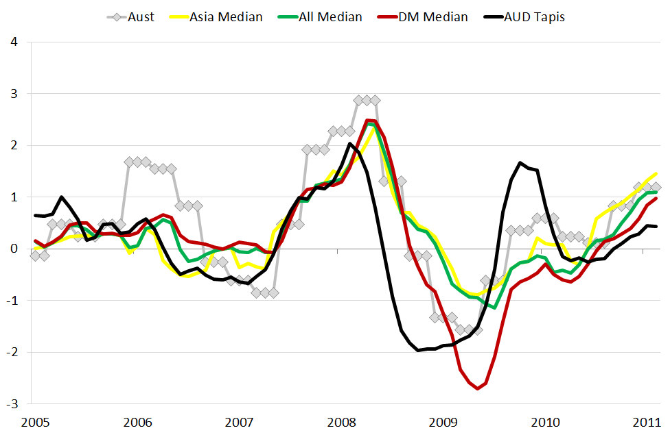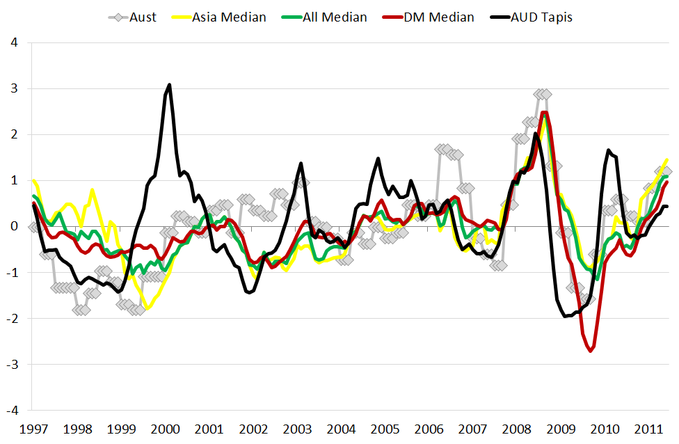 So what’s going on? Why do we see such co-ordinated swings in global inflation, which appear to be preceded by oil, given that oil is only 5% of the CPI basket and that the transmission from oil to core CPI varies so much between nations?