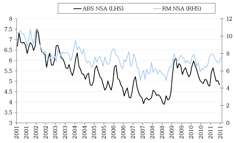Empirically, the PR is pro-cyclical, and coincident – but you would want to see more data before saying that the recent move means anything, especially as the floods will have probably played some part in the sampling issues.