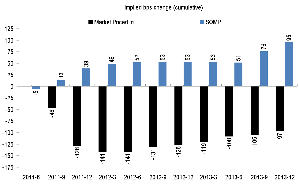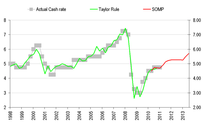 The Taylor rule says the RBA has 50bps to do across Q4’11 and Q1’12, and then another 50bps in 2013.