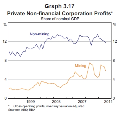 The RBA Statement on Monetary Policy yesterday showed that corporate profits as a percentage of GDP have been falling.