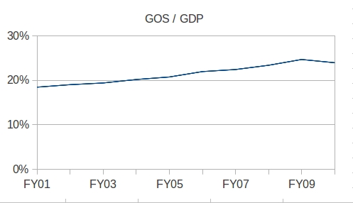 Company tax receipts to GDP are the function of two ratios: (All figures here are for non-public corporate Gross Operating Surplus)