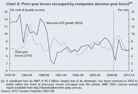In that budget Treasury were assuming quite a rapid removal of prior year losses, from just under 10 per cent of taxable income in 2010-11 to just under 6 per cent in 2012-13. After the 1990s recession a similar fall in prior year losses took 4 years rather than 2 to acheive. As you can see in the graph below, there was a blip in 1994-95.
