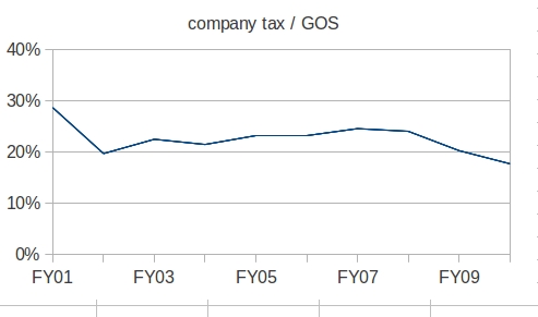 If the tax / GOS ratio is one percentage point lower in the next two years, the government is facing a $4.3 billion hole in 2011-12 and a $4.2 billion hole in 2012-13. The surplus in 2012-13 is projected at $3.5 billion in the budget.