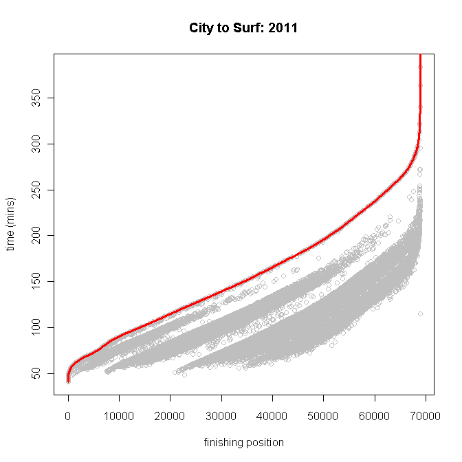 The grey points are net-time (from your bib-tag), and the red line at the top is gross time (time on the official clock). Thus, if you finished (say) 30,000th your personal time is a grey point (at 1hr 13m 04s), and the official city-to-surf clock read 2hr 19m 27s when you crossed the line.