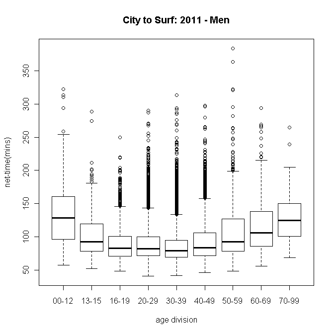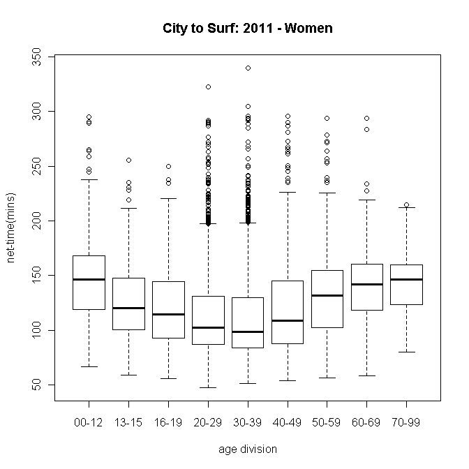 I am surprised to see how much variation there is in Women’s results. Performance improves markedly as women move into the 20-29 division, is steady in the 30-39 division and then falls away similarly sharply thereafter.