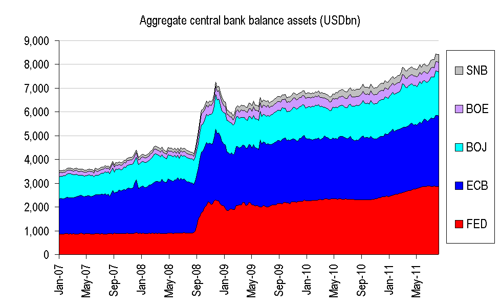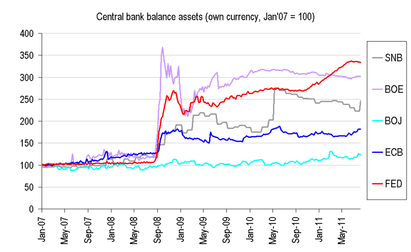 The truth is that QE never ended. Major central bank balance sheets (Fed, ECB, BoJ, BoE and SNB) continue to expand apace, and are expanding as rapidly just now as they did in the Fed’s QE2 period – it’s just who is doing the QE that has changed…
