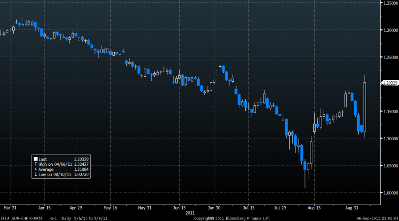 Today brings still more QE. Annoyed by the expensive CHF, the SNB is (again) trying to move their currency. This time, they have announced a commitment to keep their currency at a minimum level of 1.2 against the EUR (that is, a 1.20 floor for EURCHF).So far, they have suceeded.