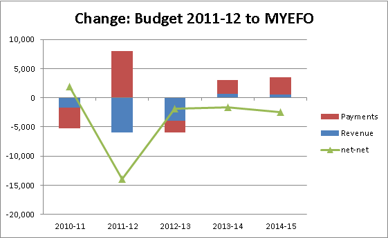 If you have a keen eye, you may also be able to see that payments are actually higher in the MYEFO than in the 2011-12 Budget. That’s because they’ve added some stuff in.