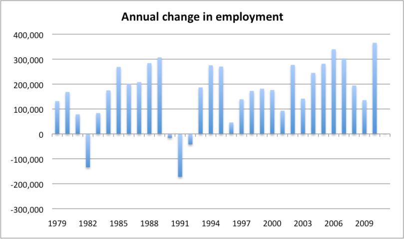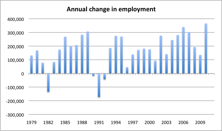 Here is the chart of annual employment growth over the past 30 years.