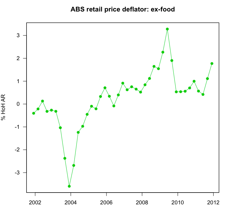 The median spread between the retail price deflator (ex food) and trimmed mean CPI has been ~60bps since Q3’01 (the post GST period), so that means that it’s probably the case that core inflation pressures were running around 2.5%y/y in H2’11, and not the 2%y/y pace that you’d get if you simply annualised the Q3 and Q4 Trimmed Mean CPI prints.