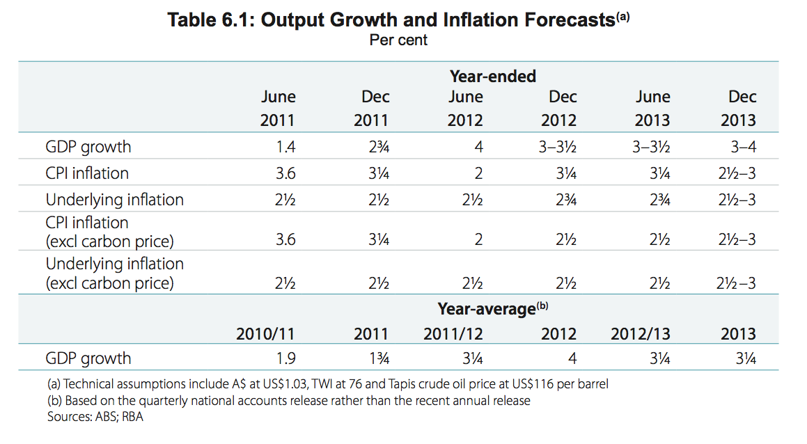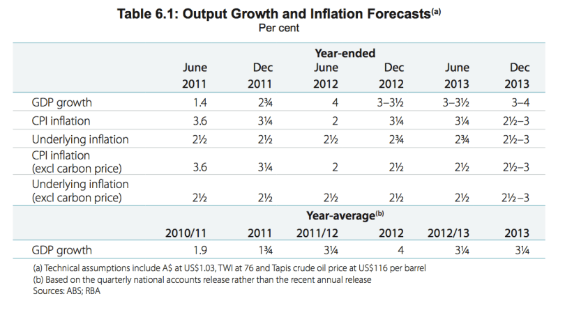 That means that the RBA is just as likely to be revising up their inflation forecast as revising it down in 2012. And recall that assuming a 4.5% policy rate, the RBA forecast that inflation would be in the top half of their target range in H2’13 (when policy has had it’s full impact).