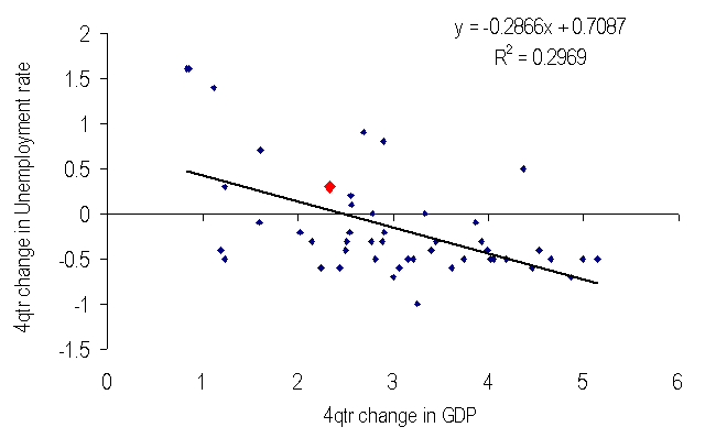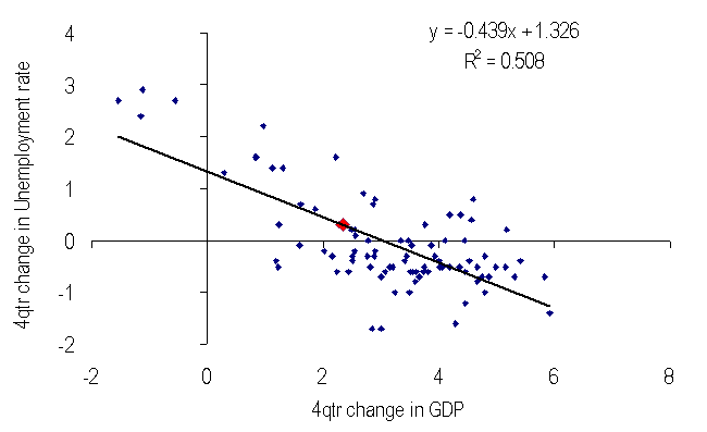 If you look at the Okun relationship (change in Unemployment rate v. change in GDP), the labour market outcomes over the prior year are actually a little weaker than you might have expected.