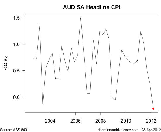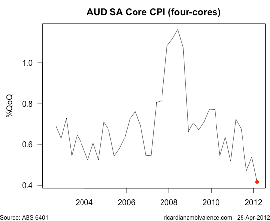 My guess is that the inflation print will have challenged the RBA staff. Inflation is not just weaker than expected – it’s too low. There has been no inflation for two quarters. The weak supply side story we have all been telling now seems to be fatally damaged.