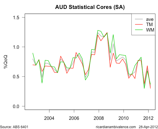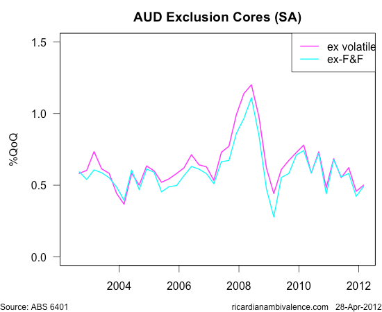Some have said that the RBA will look through it as it’s ‘just food’ – but that’s not the case. If you look at the ex food and fuel, and ex volatile measures, they tell broadly the same story (note: I seasonally adjusted these measures at the aggregate level to make them comparable with the WM and TM measures, which is fudging bit).