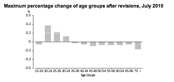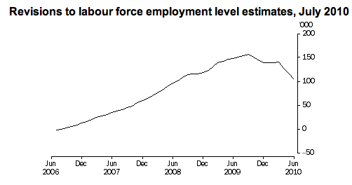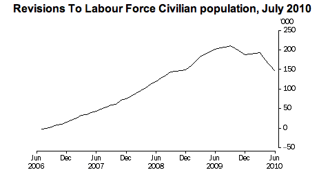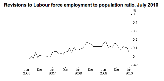 The ABS explained how it all works in last Thursday’s labour force publication. There are two sources of revision – the levels estimates are revised, as the population count is revised. And there can be small changes to the ratios, as new information about population composition changes the weighting of the survey results.