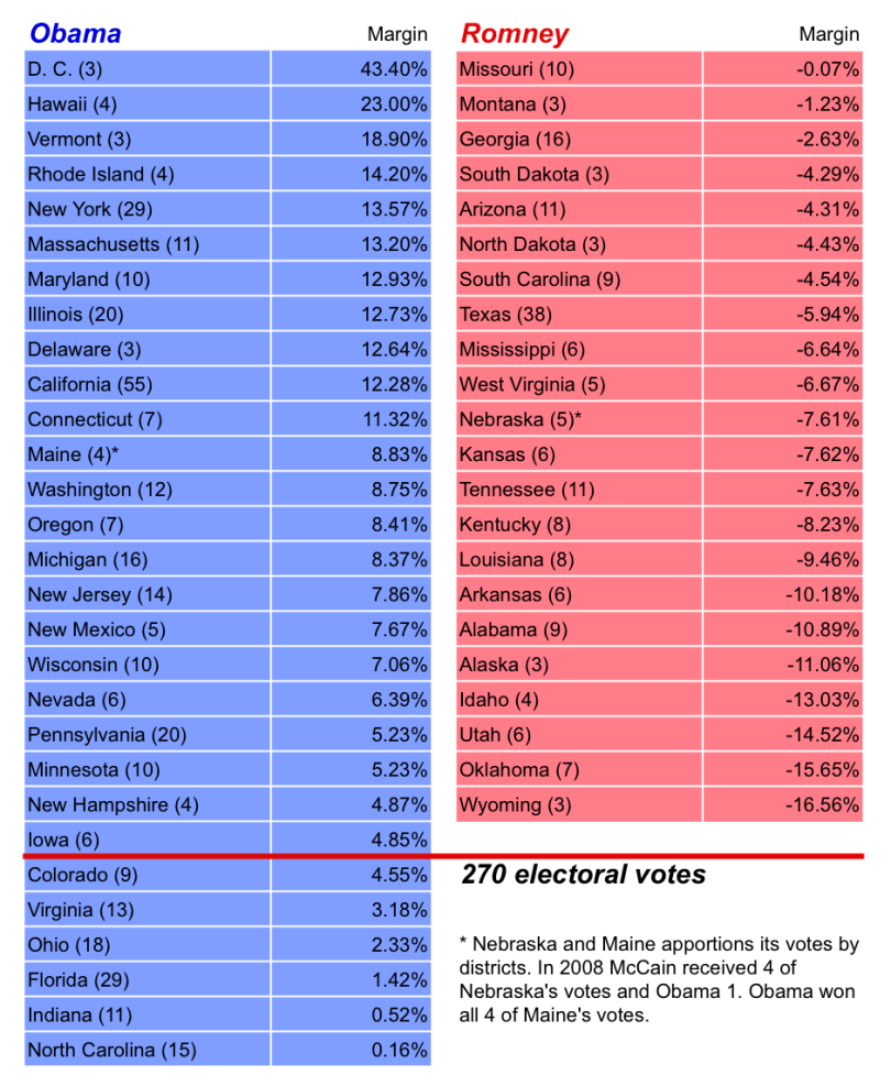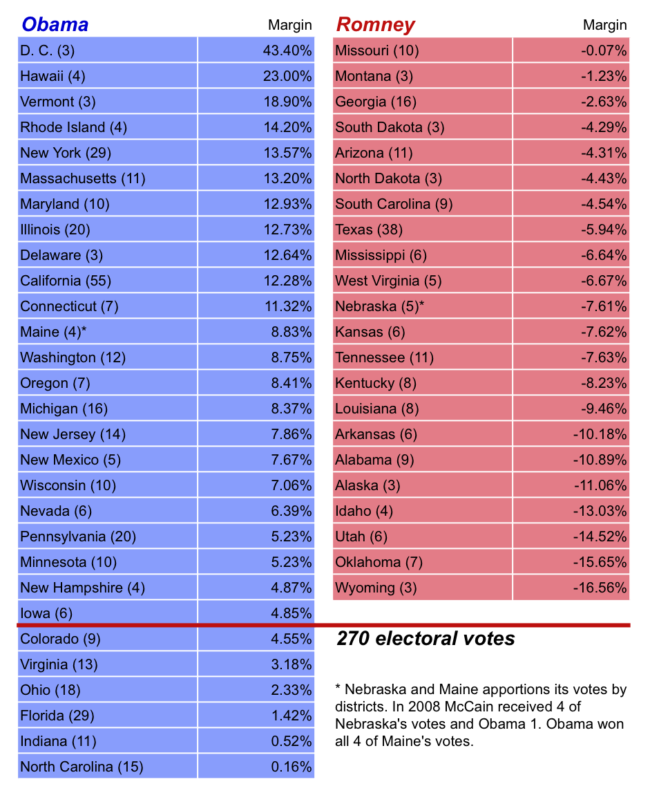 Romney needs a 4.55% swing compared to the 2008 result to win the necessary 270 electoral votes to win. The key states will be North Carolina, Indiana, Florida, Ohio, Virginia and Colorado. That said, if Romney can win Pennsylvania, with its 20 votes, that will change the calculus considerably.