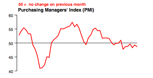 The weakness of the Chinese and European (flash May) PMIs tells an interesting Macro story. With a bit of imagination, it is possible to see hints that the European recession is showing up in China. From there, the next step is for it to show up as lower demand for Australian Exports – and hence lower (or slower) investment demand, and therefore slower Australian GDP growth.
