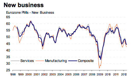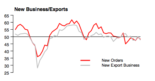 My conjecture is that at least some of the weakness on the new orders side is due to weak final demand due to the recession in Europe. The concurrent weakness of new export orders is a key part of this judgement.