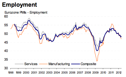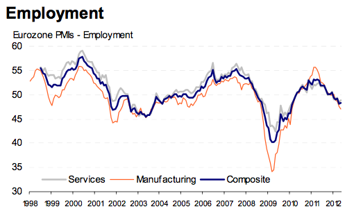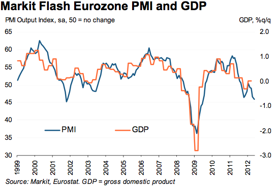 If sustained, the EUR Composite PMI is consistent with European GDP contracting by ~0.75%q/q in Q2. With no resolution in sight, and monetary policy already maxed out, it’s easy to see a 2% contraction in 2012.