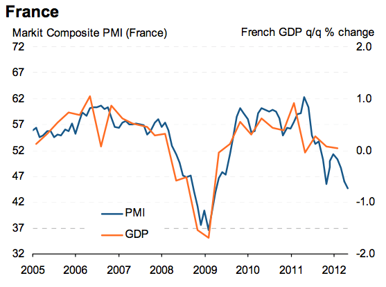 Most surprising to me is the recently terrible performance of France. The PMI suggests a pace of contraction of ~0.75%q/q …