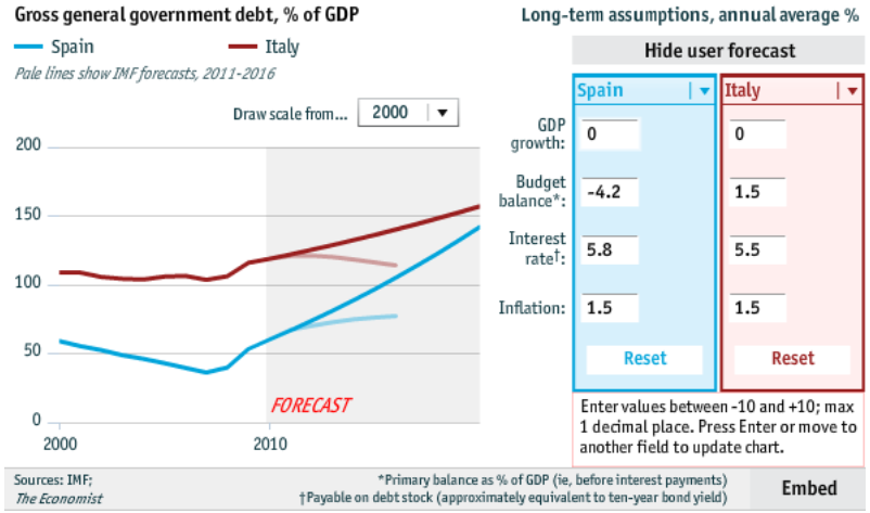 The high level of yields, and the recessionary growth outlook, means that Italian and Spanish debt dynamics may be already unstable.