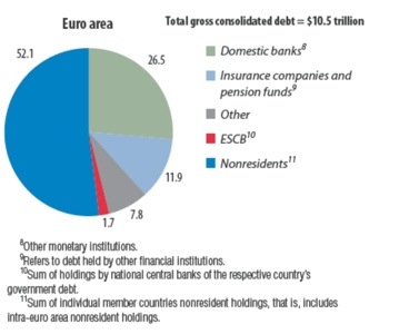 For the most part, only small amounts of capital are reserved against these Sov bonds holdings (as they are ‘risk free’ according to regulations). Thus, a sharp decline in bond prices may wipe out the capital of some European banks, and spread the trouble (this is a key contagion mechanism).