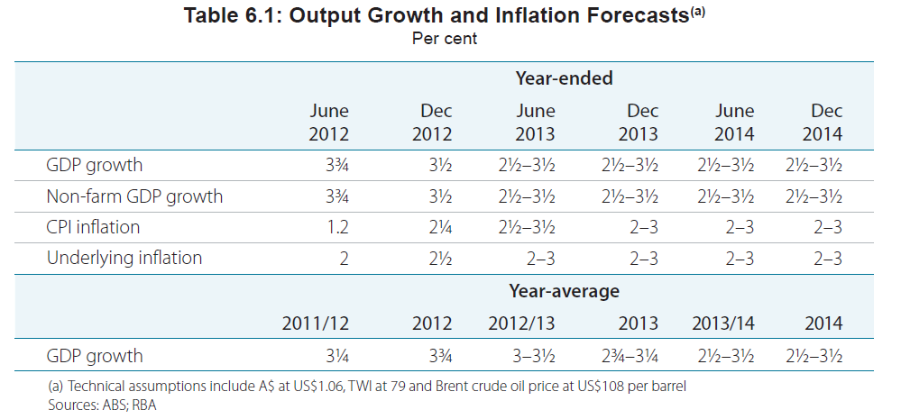 My guess is that the downside risks will see the RBA revising down once again, and cutting – however given that they have modest assumptions, it might not be until Q1’13 that things are sufficiently disappointing to get that to occur. One thing’s for sure, it’s hard to see them cutting until their ‘trend everything’ forecasts change.