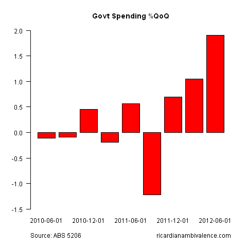 I had expected that the consumption of government transfers and the income boost from the ‘tax cut’ we all got as the Qld flood levy rolled off would mean that private demand would firm in H2’12. The partial data we have for Q3 suggests I was wrong — private demand has been weakening.