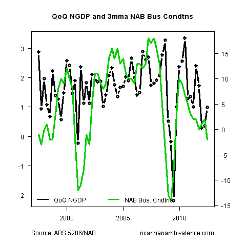 The fact is that firms live in a nominal world – business surveys tell you how business is feeling, and business feels good when profits are rising. Thus, we find that the business surveys tend to be firm when NGDP growth is above average, and weak when NGDP growth is lower than average.