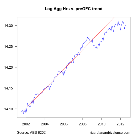 So there you have it: we get the weak job ads and falling hours worked that you’d expect given dismal profits / weak NGDP growth … but (at least for the moment) we do not see a rising unemployment rate.