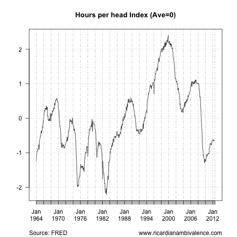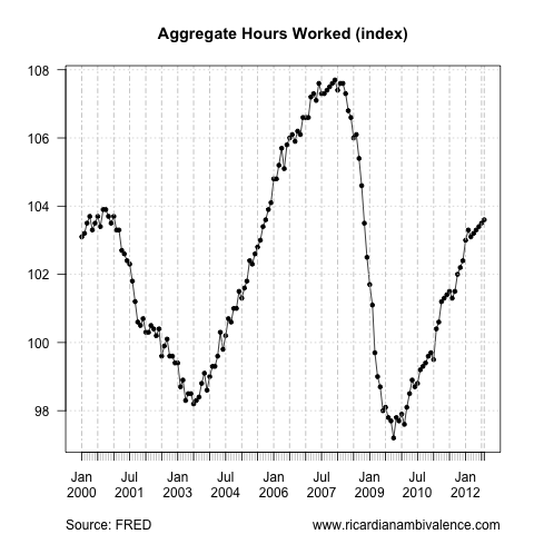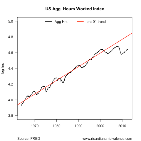 Anyway, If you are right Ricardo that the problem is mainly cyclical, this suggests that policy has been too tight for many years – perhaps even before 2008, and maybe even since the early 2000s. It suggests that the problem of people confusing a low FF rate with an easy stance of monetary policy has been causing problems for years. What else would explain the sustained deviation in hours worked from the trend line? Supply-side problems (excluding labour market rigidities of course) could mean lower productivity, but why would they result in slower growth in hours worked? Both Sumner and the ECRI have noted that US recoveries have been getting weaker since the early 1980s, which suggests that given downward nominal wage rigidity, we may need to accept a higher rate of inflation to sustain low unemployment.