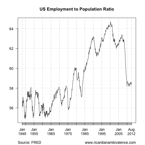 None of which is to suggest I don’t think there are obvious cyclical impediments to stronger employment numbers. I think Sumner’s “75% demand, 75% structural” argument has some merit. To some extent demand side weakness is exacerbating structural deficiencies. Your data seems to support this: employment has been bad since the dot com bust but strong growth until the great recession masked this weakness. The US needs some serious micro reform. However I am not optimistic. Sumner seems to be optimistic that addressing ad deficiencies will spur structural reforms. Your data suggests otherwise: then recovery up to the Great Recession didn’t result in much structural reform and so the labour market is suffering as a result.