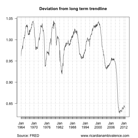 To better show the output gap, i’ve taken the difference between the pre-2001 trend line and the actual data. This measure suggests the output gap reached ~17% of potential in Q3’09, and recovered to ~15% of potential in Q1’12 — and has since slouched back to ~16% of potential.