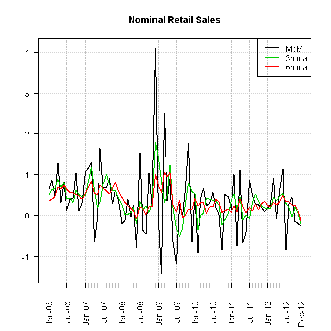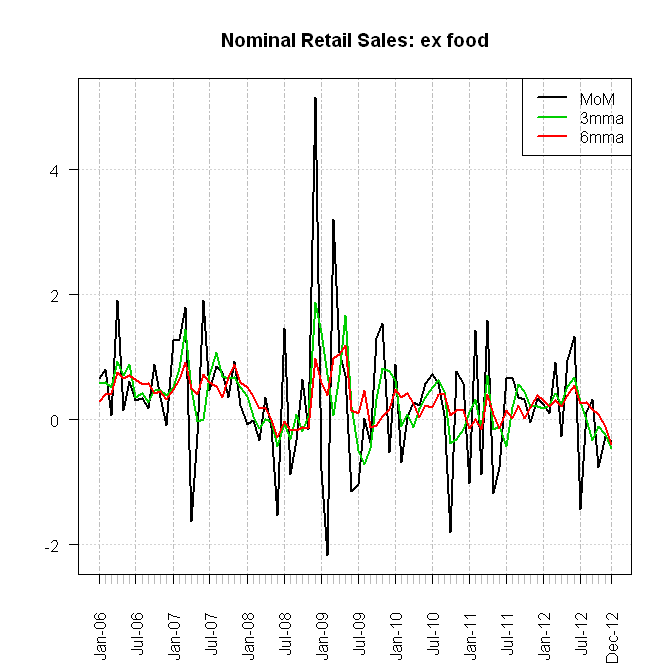 The 6mma is probably the best compromise betweeen the SA estimate and the trend (it’s a little more sensitive than the trend) — this moving average growth rate tells the story clearly: trend growth is weakest, including the GFC. Of course part of this is the structural shift onto online shopping, and hence out of the surve frame.